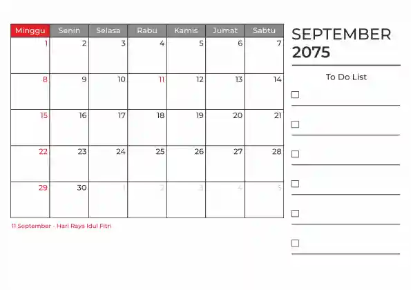 Template kalender 2075 duduk planner. Ada space kosong yang bisa di isi untuk menulis catatan dan ada space untuk menulis to do list.